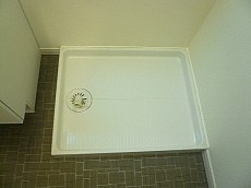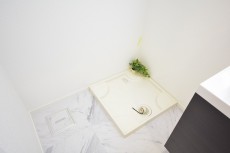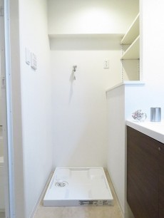 洗面台並びにある洗濯機置き場です。洗濯洗剤や柔軟材など置くスペースはお隣の洗面台下の収納などに置けると便利ですね。