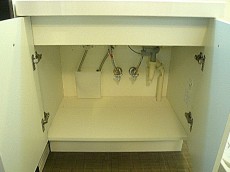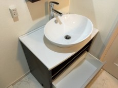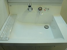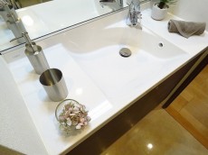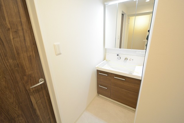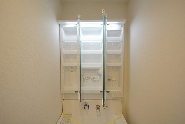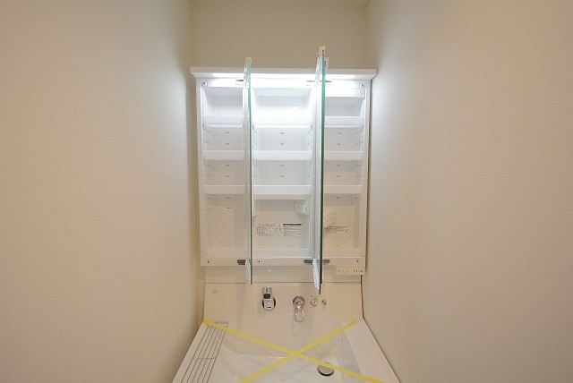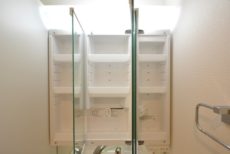 みやすい三面鏡の洗面化粧台です。スタイリッシュな洗面ボウル左にはちょっとした物が置けるスペースがあります。今の季節、インフルエンザなどの予防の為にもうがいは絶対!そんな時のコップ置きに良いですね。収納も上下にあり、以外に細かいものが多い洗面台、仕切りのある三面鏡の裏に整理整頓できるのでゴチャゴチャしがちな洗面台スッキリと使えそうですね。