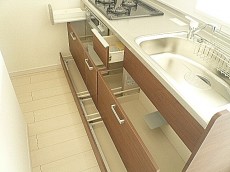 シンク下・コンロ下ののキャビネットはスライド式なのでキッチングッズの収納も楽々(●´∀`●)