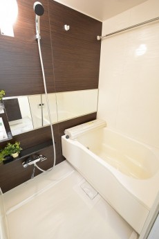追炊き・換気乾燥付き浴室です。濃いブラウンのアクセントパネルがリラックス空間を演出、一日の疲れとる大事な空間ゆっくりと入浴タイムを満喫できそうです。