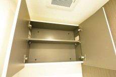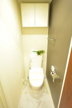トイレは洗浄機能一体型。掃除道具やトイレットペーパーのストックの収納に便利な吊り戸棚も付いています。