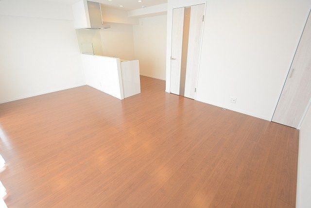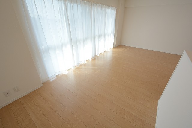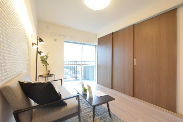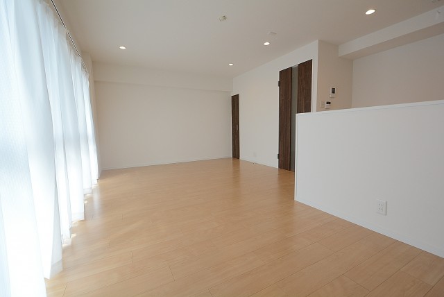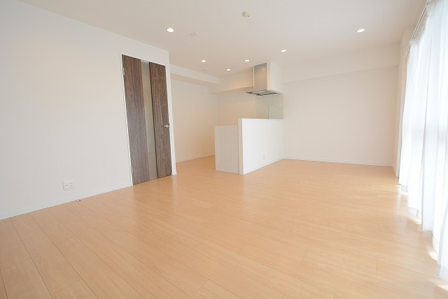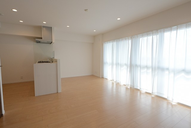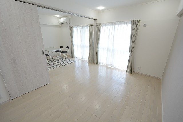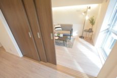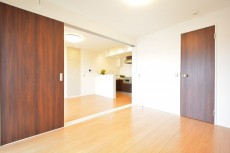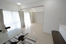 こちらは約9.1帖のリビング・ダイニング・キッチン+約5.8帖の洋室。仕切り戸を開けて2部屋をつなげた様子です。もちろん別々に使う事も出来ますが、ライフスタイルや状況に応じて選択肢が多いのは嬉しいですよね。南向きバルコニーに面した窓からの光が眩しいお部屋です。