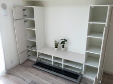 壁面には、真っ白な収納が設置してあります。テレビ置場もバッチリ♪♪