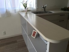 一見カウンターキッチンのようですが、キッチンの背後にカウンターを造り付けています。調理や配膳に使ったり、家電を置けたり、下部には収納も出来る何かと便利なスペースです。