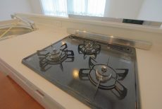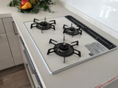 3つ口コンロもホワイトのものでキッチンに統一感があります。シンク&ワークトップは大きめで使い勝手◎