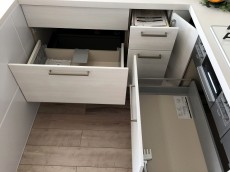 調理台には明るい木目パネルを使用。リビング側から見た時に圧迫感を感じないようになっています。収納は引き出し式のスライドキャビネットなので出し入れも楽々ですよ。