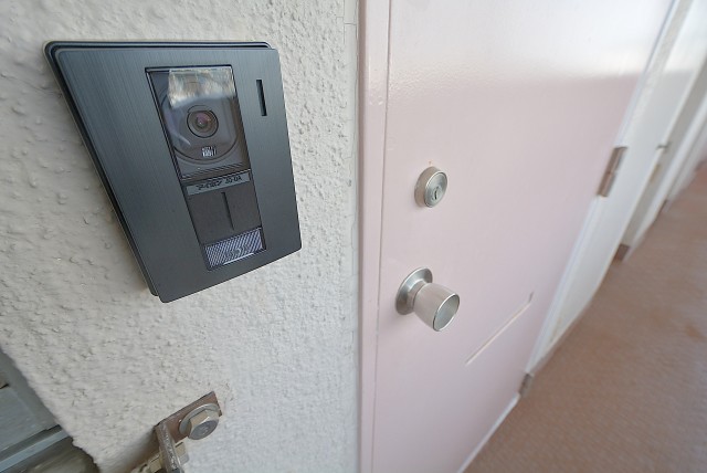 ピンクの玄関ドアからお部屋へ。インターホンは安心のモニター付き。