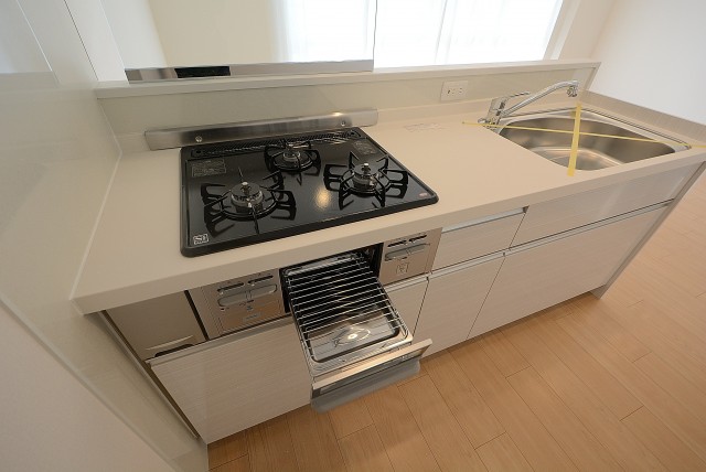 コンロは2口、グリルも付いています。グリルって魚で使う事が多いですが、他の素材にも使えますのでどんどん使っていきましょう。レシピもたくさんありますから、是非一度調べてみて下さい。