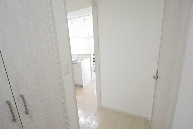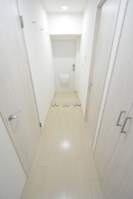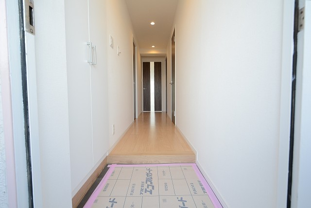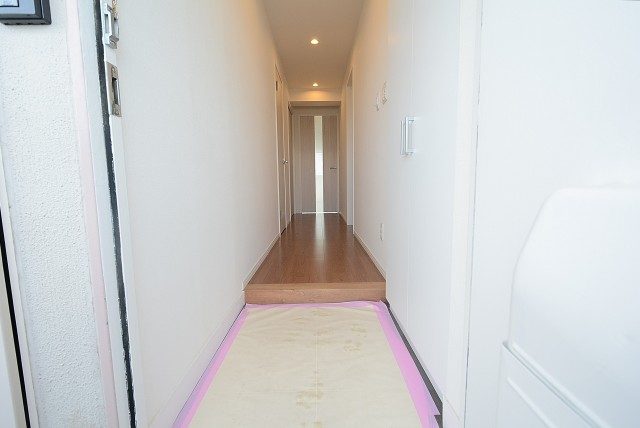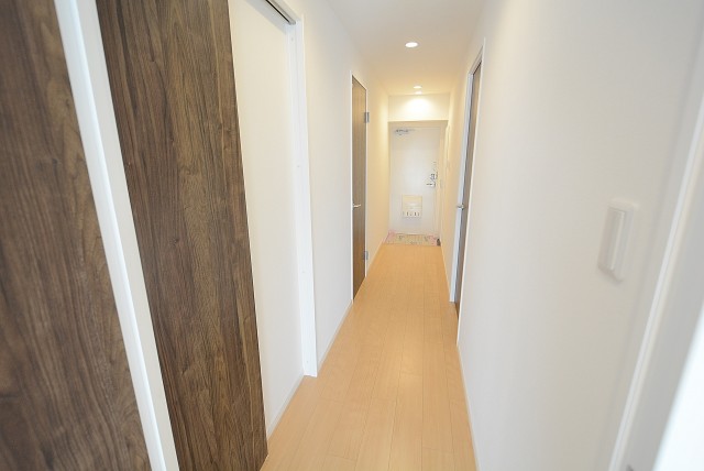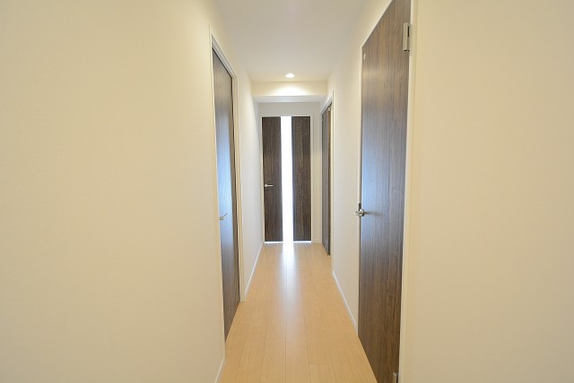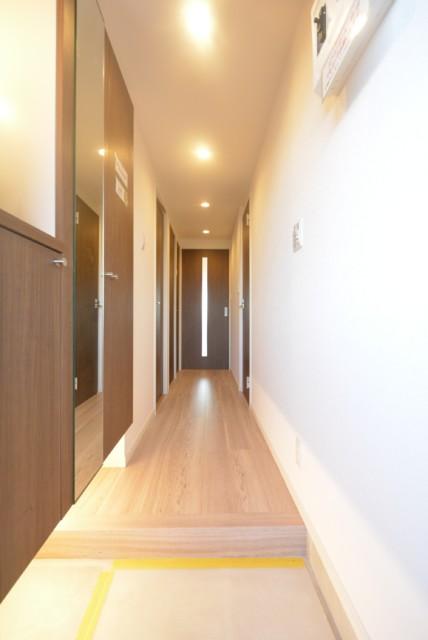 廊下は少し濃いめの建具で落ち着いた雰囲気。正面ドアのスリットガラスから漏れる光が、明るいお部屋への期待を高めます。