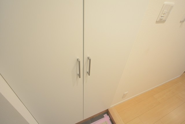 白を基調にした明るい雰囲気の玄関です。シューズボックスは収納力のあるトールタイプなので玄関に靴が溢れるなんてこともありません。出しておきたい靴はシューズボックス下のスペースに置くようにするとスッキリ見えますよ。人感センサー付き。
