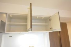 上部には吊り扉と換気扇。キッチンって物が多くなるので、収納が多いのは助かります。調理中は換気扇をお忘れなく。少し早めに回し始めると効果的らしいですよ。