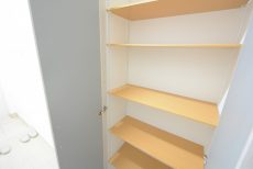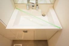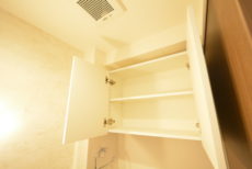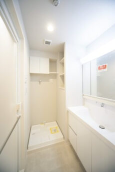 サニタリールーム内の収納スペースが洗面台のみで少ないですが、洗濯機置き場周りにスペースがあるので、収納棚などが置けそうです。
