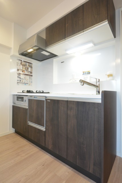 キッチンは壁付けタイプ。使いやすさや、場所を取らずにお部屋を広く使えるというメリットがある一方、キッチン内が丸見えになるというデメリットもあります。掃除や整頓を心掛けましょう。