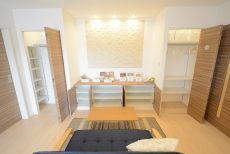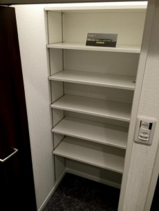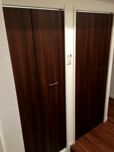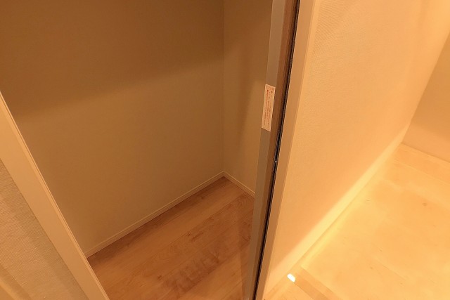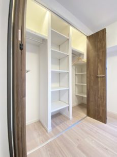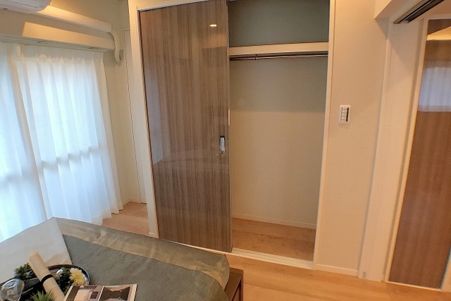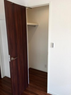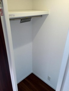 収納はハンガーポールや棚が設置されたマルチクローゼット。幅も奥行きも広く、キャリーバッグやスーツケースなどの大きな物でも置いておけますよ。間口が広いので使いやすそうな収納ですね。