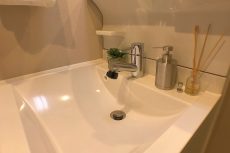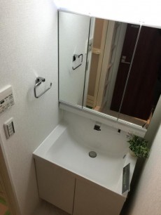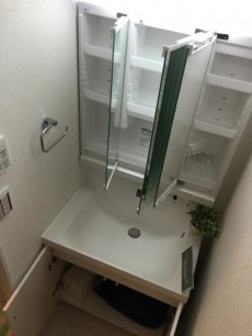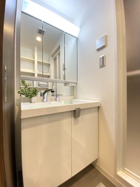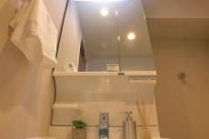 洗面台は三面鏡付き。上部の照明のおかげで、鏡を見る時に影になったりする事もありません。