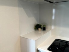 調理台後ろには冷蔵庫や家電ラックなどを置けるようなスペースも確保されています。キッチン横の扉は洗濯機スペースでした。収納かな?と思って開けるとちょっとビックリしますね(笑)キッチンそばに洗濯機って不思議な気もしますが、料理と洗濯同時に出来ると思えば効率的な気もします。
