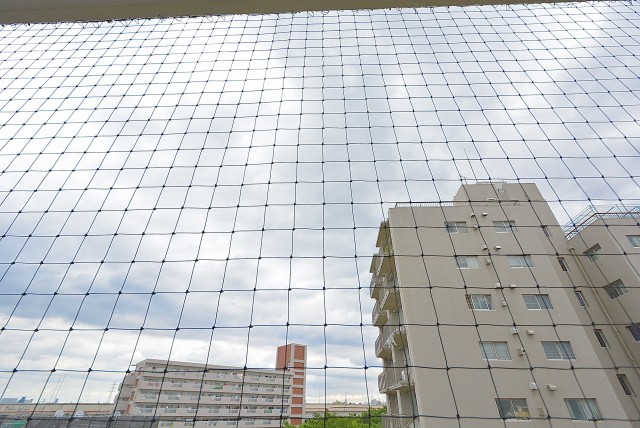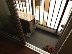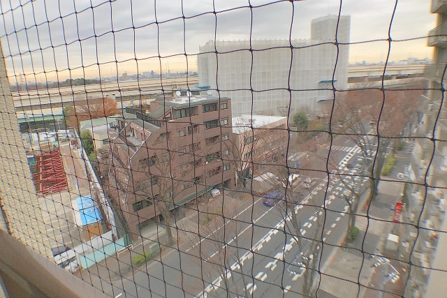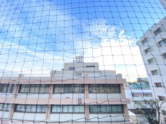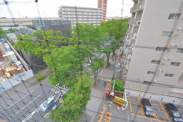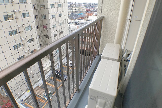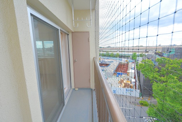 奥行きはあまりありませんが、二部屋にまたがる幅の広いバルコニーです。南向きで陽当りも良好!手すりも下まで柵になっていてとても開放的ですよ。