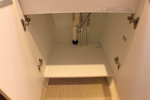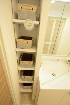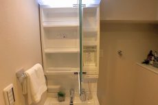 収納は洗面台下と三面鏡裏のキャビネット。細々とした物が多くなりがちな洗面廻りには、収納はいくらあってもいいですよね。