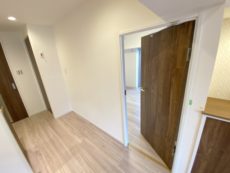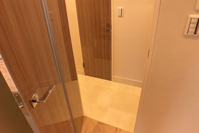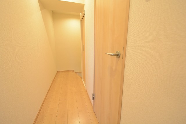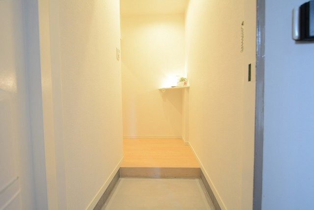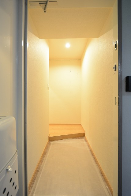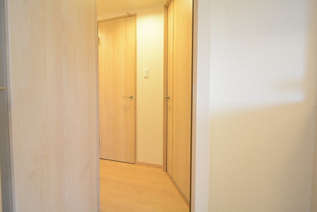 廊下は左に曲がっていて、宅配便やフードデリバリーの受け取り時にお部屋の中が見えないようになっています。ドタバタしてドアが開けっぱなしとか、たまにありますよね^^;)