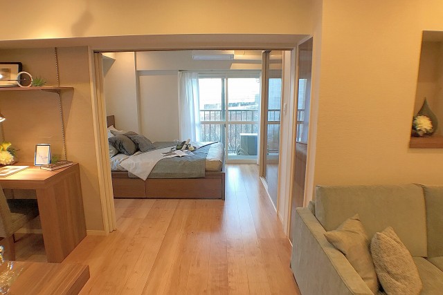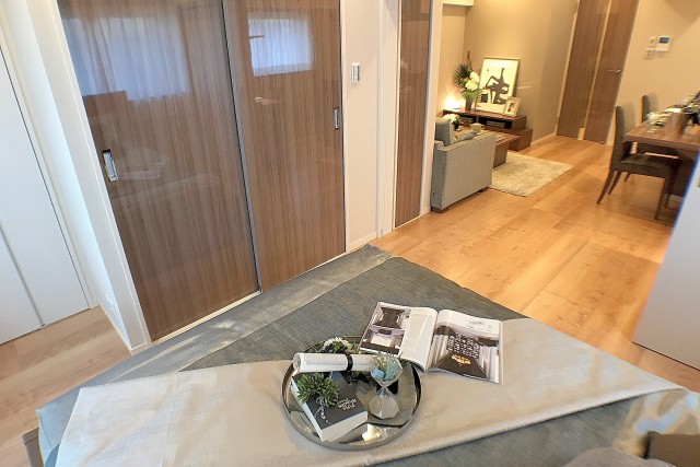 開放すればこのように二部屋をつなげて使うことも出来ます。ご家族構成やライフスタイル、状況によって使い分けが出来るのは便利ですよね。