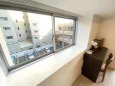 こちらは約4.6帖の洋室。東向きのバルコニーに面した窓のあるお部屋です。外は建物も遠く開放的。バルコニーには収納も付いていますよ。