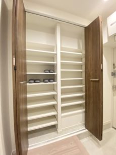 玄関から廊下にかけて設置されたシューズボックスはトールタイプ。天井高まで使えて収納力抜群!可動式の棚を調節すれば、ブーツなどでもそのまま収納可能ですよ。左に続く廊下には3枚の扉が並んでいました。
