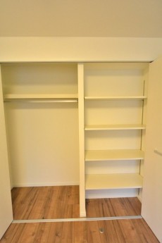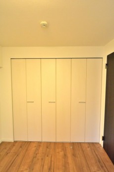 洗面室の向かい側は約5.0帖の洋室。壁一面にはクローゼットと棚がついた大型の収納が設けられています。収納が大きいと生活スペースを有効的に利用できるのがいいですね。