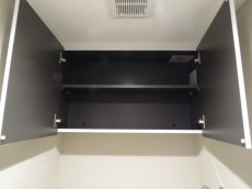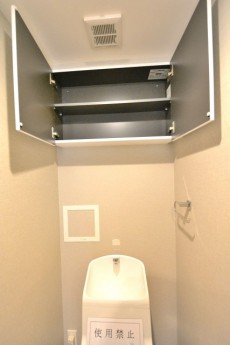 ウォシュレットとペーパーのストックの保管に便利な吊戸棚が設置されています。