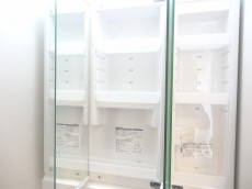 洗面化粧台の鏡の裏は一面収納になっています。ゴチャゴチャ散らかりがちな水まわりのハブラシや小物もスッキリ収納いただけます。