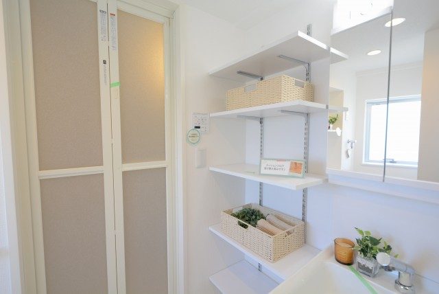 キッチン同様、真っ白な洗面化粧台。横には高さの変えられる収納棚がつくられています。タオルやシャンプー類のストック、着替えを置いたりと便利です。