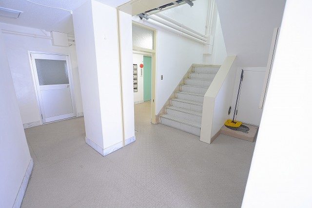 エントランス入った1階共用部。年季が入った雰囲気ですが、なんだか落ちつく感じ・・・。ちなみに清掃はキレイに行き届いています。右に階段、奥にエレベーターがあります。