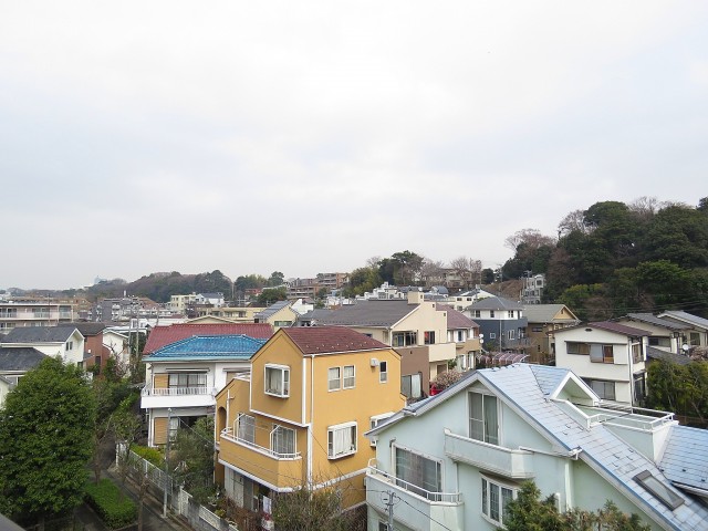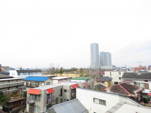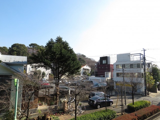 眺望。住宅の向こう側に緑、さらに眼下は緑道と緑たっぷりの風景です。高い建物がないので空も広く見えて爽快です。