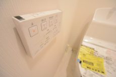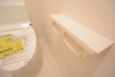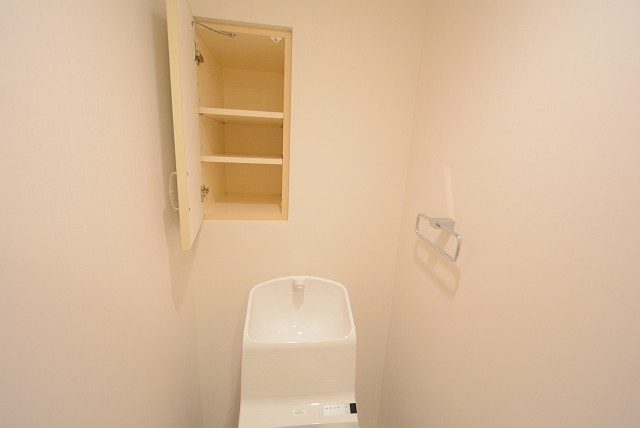 ウォシュレットとペーパーのストックを保管しておくのに便利な吊戸棚が設置されています。