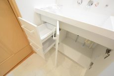 洗面化粧台は横の棚、引き出しなど小物の収納スペースが豊富。