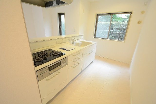 キッチンは3口コンロにグリル、食洗機付きとスペック◎!大割りのスライド収納はキッチングッズの出し入れもしやすくお料理がスムーズに進められそうです。