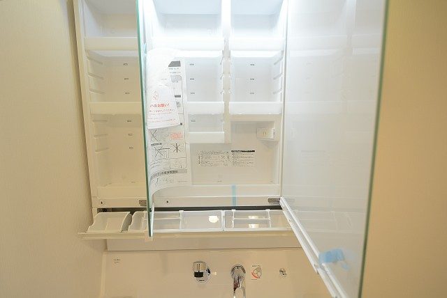 三面鏡の中や、鏡の下、洗面ボウルの下。