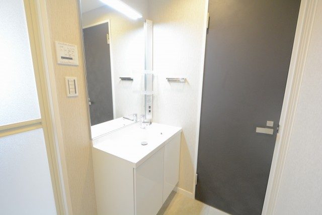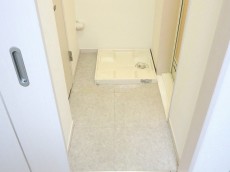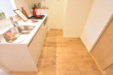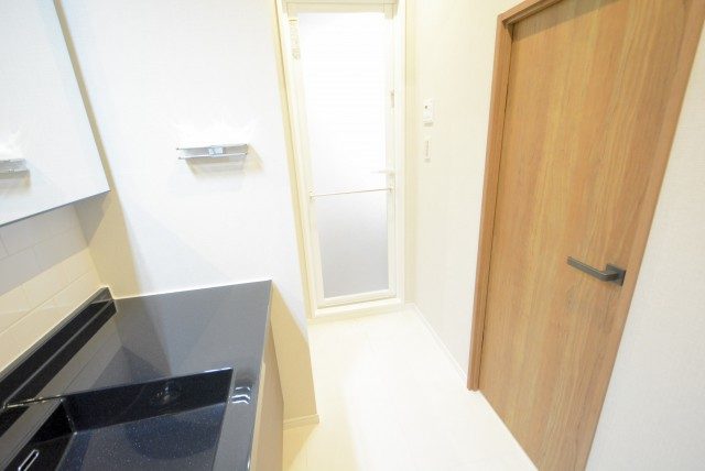 キッチンの隣りは洗面室になっています。トイレ・浴室・洗面台・洗濯パンと水廻りが揃っていますので、お掃除も簡単です!