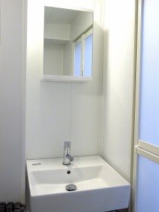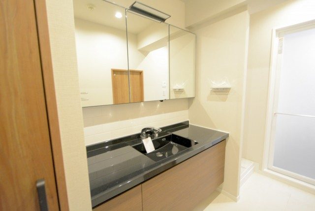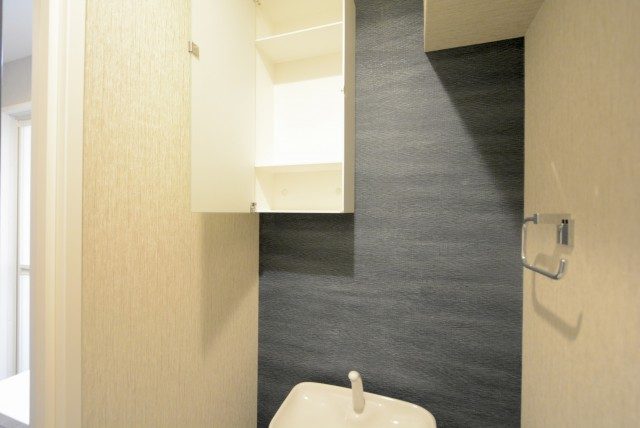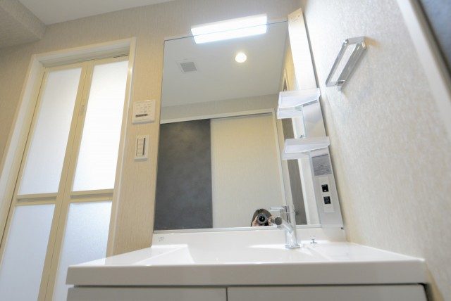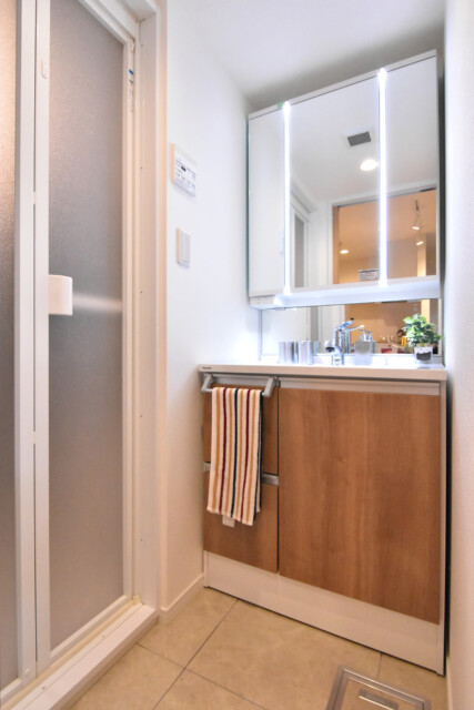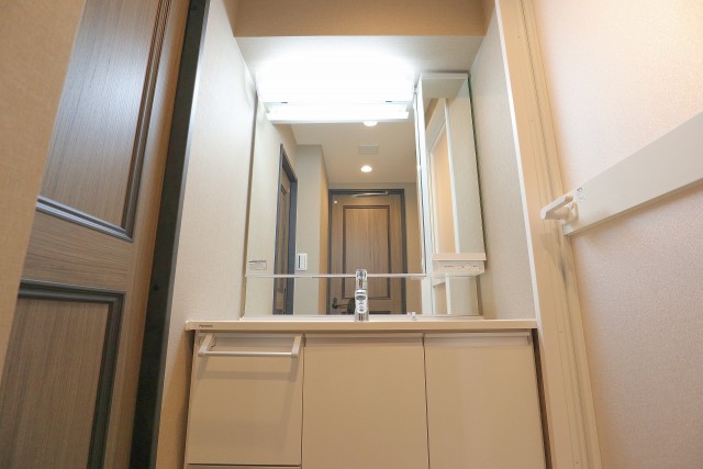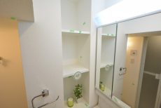 鏡隣には棚が造られており、ハンドタオルやバスタオルなどを収納可能です!