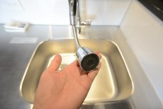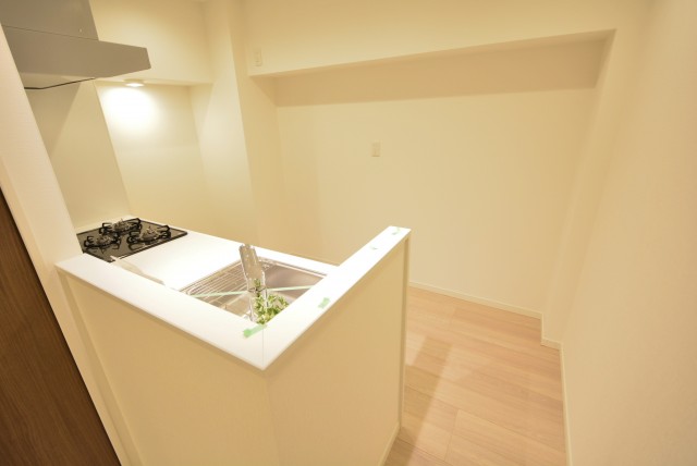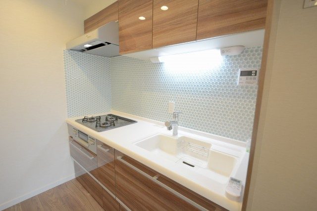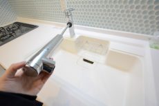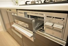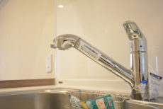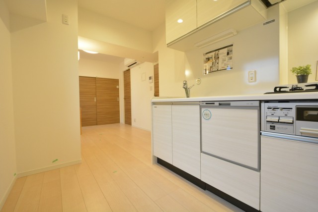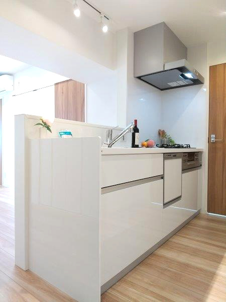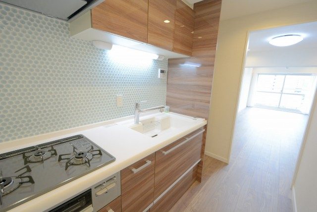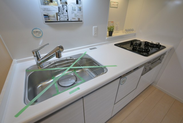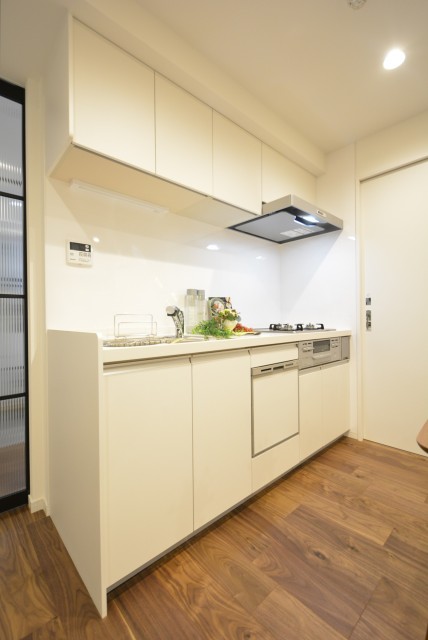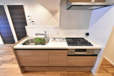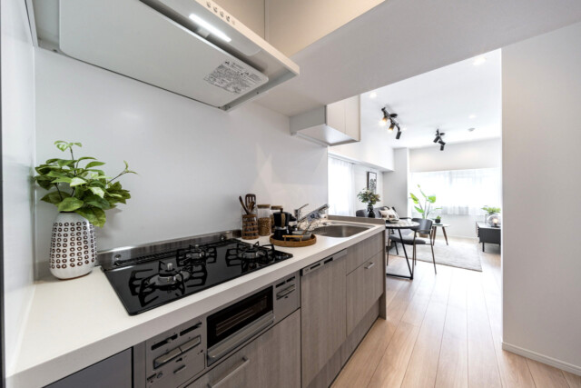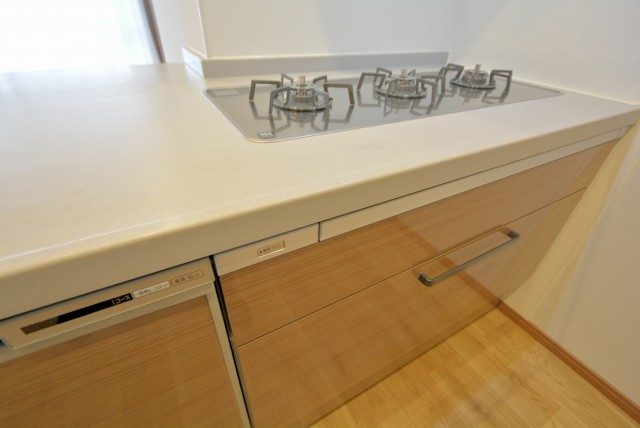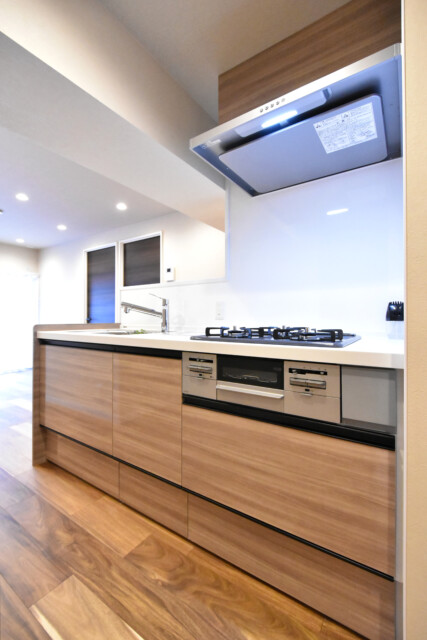 少しリビングダイニングとずらして設置されているので、コンロの油跳ねをそれほど気にしなくても大丈夫!開放感と使い勝手のバランスのとれたキッチンです。食器洗浄乾燥機や浄水機能一体型水栓なども日々の調理をアシストしてくれますよ。