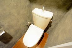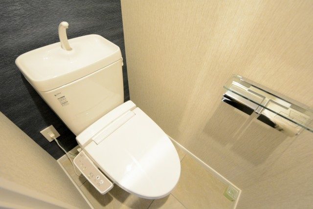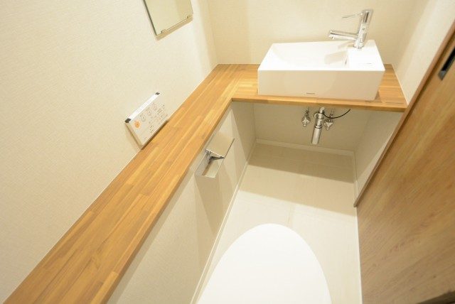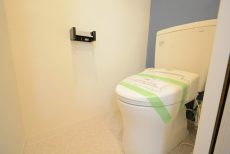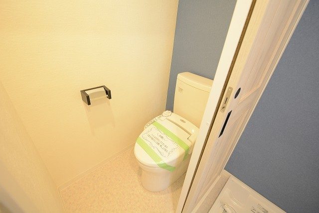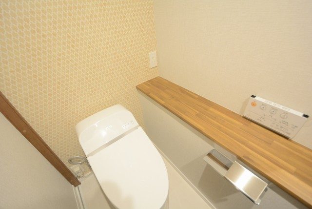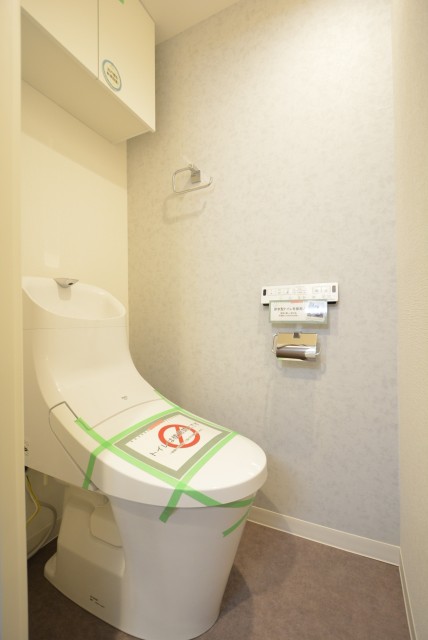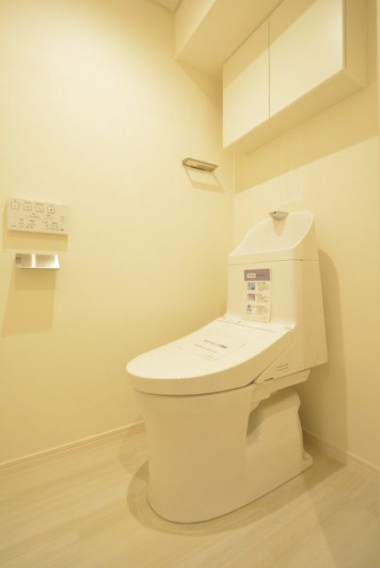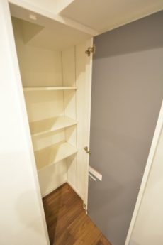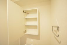 トイレは洗浄機能一体型。トイレットペーパーや掃除道具などを置いておける収納も付いています。
