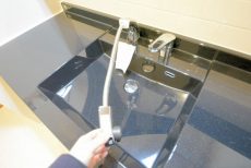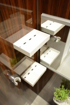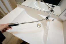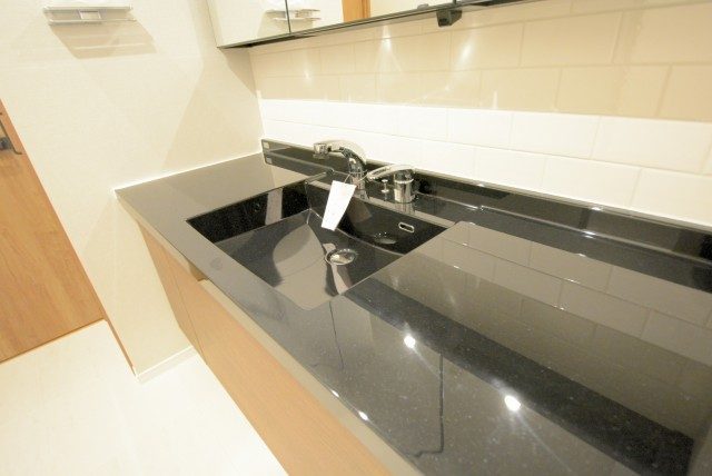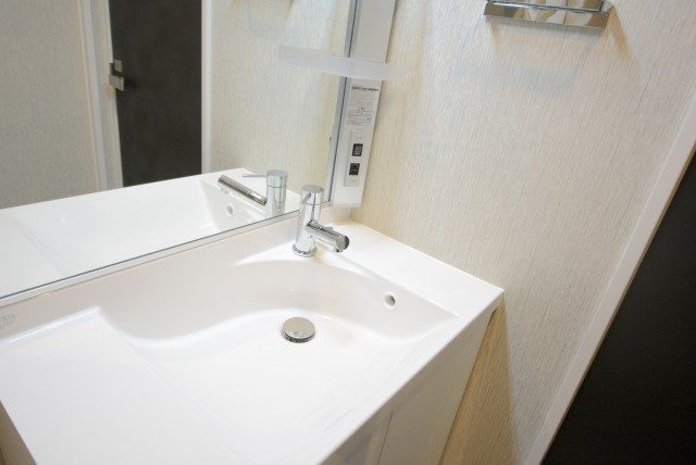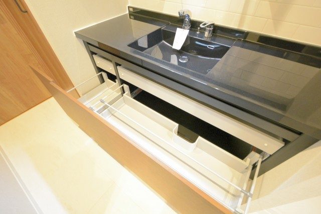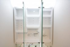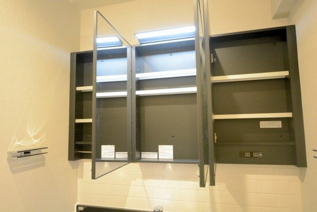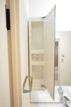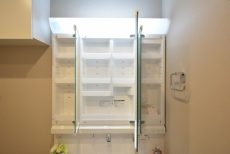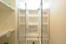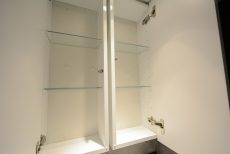 洗面台の鏡の裏は、収納スペースになっているので、歯ブラシもスッキリ収納できます。