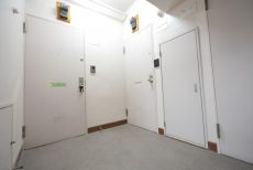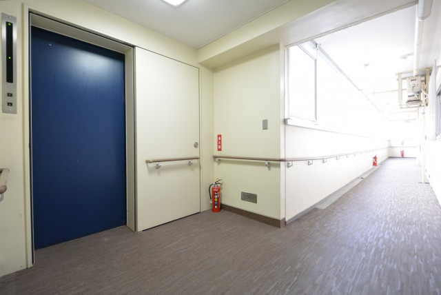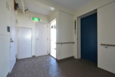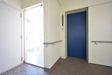 エントランスホールの奥には青色の扉のエレベーターが設置されています。