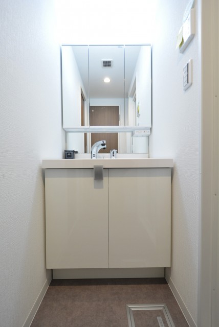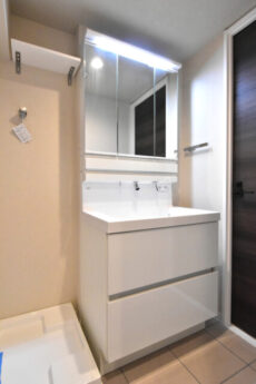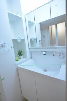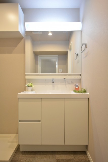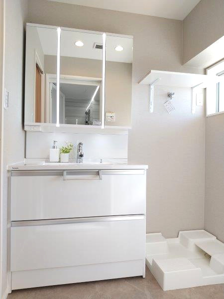 洗面室には洗面化粧台の他に洗濯機スペース、トイレ、浴室がまとまっていて脱衣室も兼ねています。洗面化粧台は身だしなみを整えるのに便利な三面鏡付き。裏がキャビネットになっているので、洗面周りに散らかりがちな細々したものもスッキリと片付けることができます。