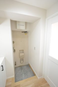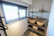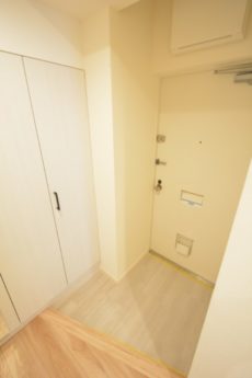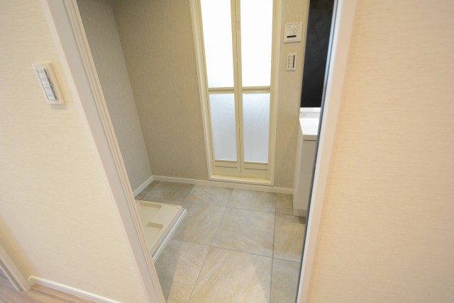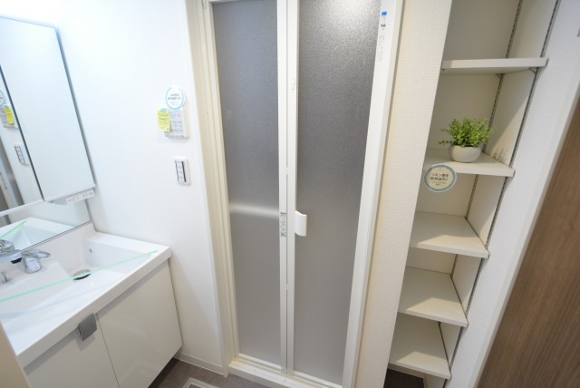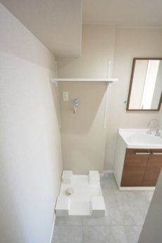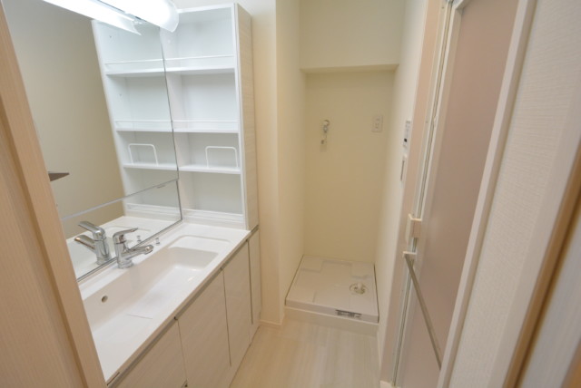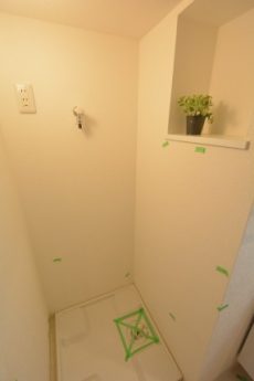 浴室とつながる洗面室には、リネン庫付きの洗濯機スペースがあります。