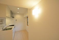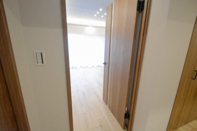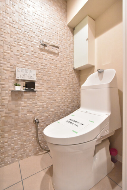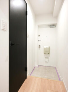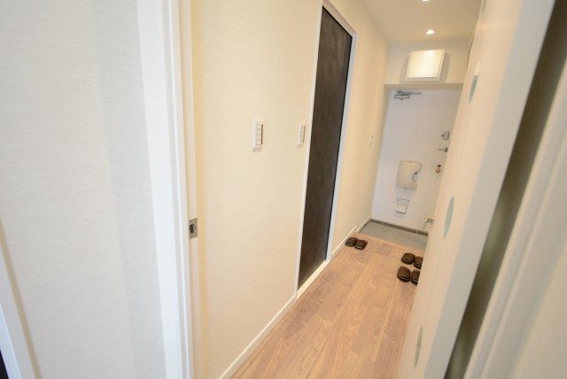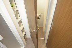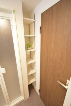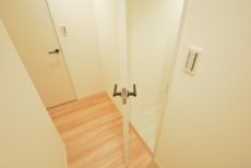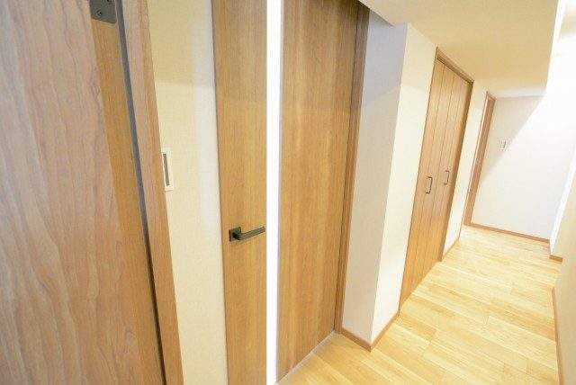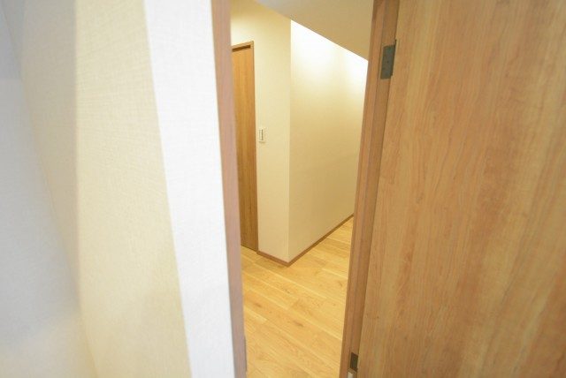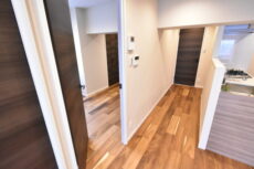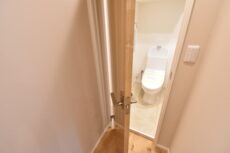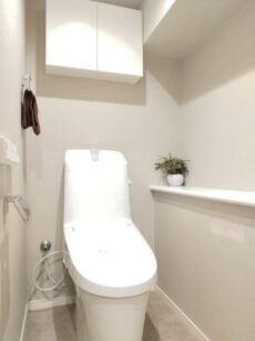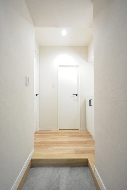 コンパクトな廊下には扉が3枚。右側はシューズボックス、正面はトイレ、左側はお部屋へ続いています。トイレは洗浄機能一体型!いろいろ飾ってインテリアを楽しめるニッチカウンターや、トイレットペーパーなどの収納に便利な吊り戸棚も付いています。