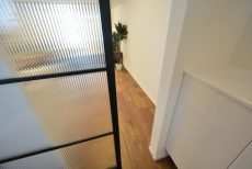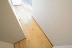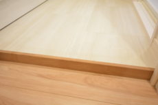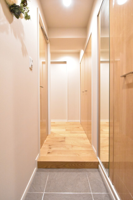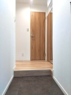 玄関からの廊下への上がり口は高さのあるタイプ。最近は段差が小さいものもよく見かけますが、個人的には土足と裸足の堺がハッキリしたこちらの方が好みです。靴を履くときに腰掛けたりもできますしね。