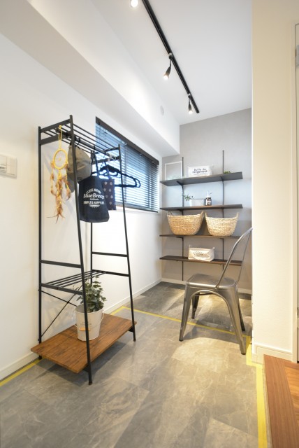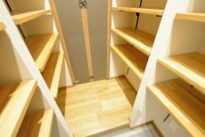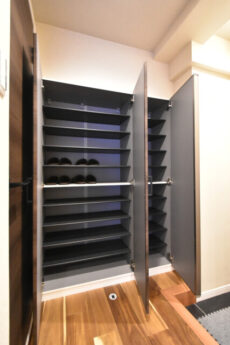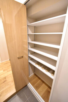 玄関右手に広いシューズインクローゼット。棚の手前にスペースが確保されているので、シューズ以外にも収納でき、玄関をスッキリと保つことができます。