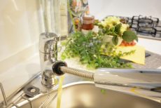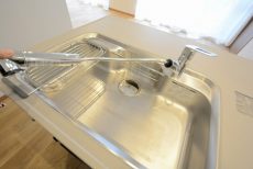 流し台には水切りの網とカゴがあり食器やまな板など、清潔に保てます!