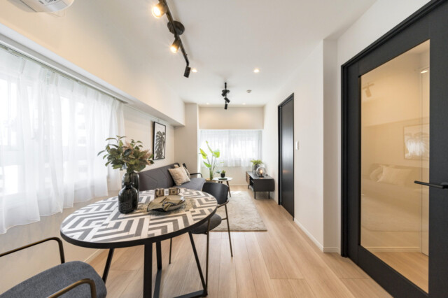 続いてはリビングダイニングスペース。間取的に、ダイニングとリビングを区切りできそうな造りですね!ガラスが印象的です!