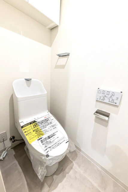 トイレはTOTO製の洗浄機能一体型。掃除道具の収納やトイレットペーパーのストックなどに便利な吊戸棚も付いています。